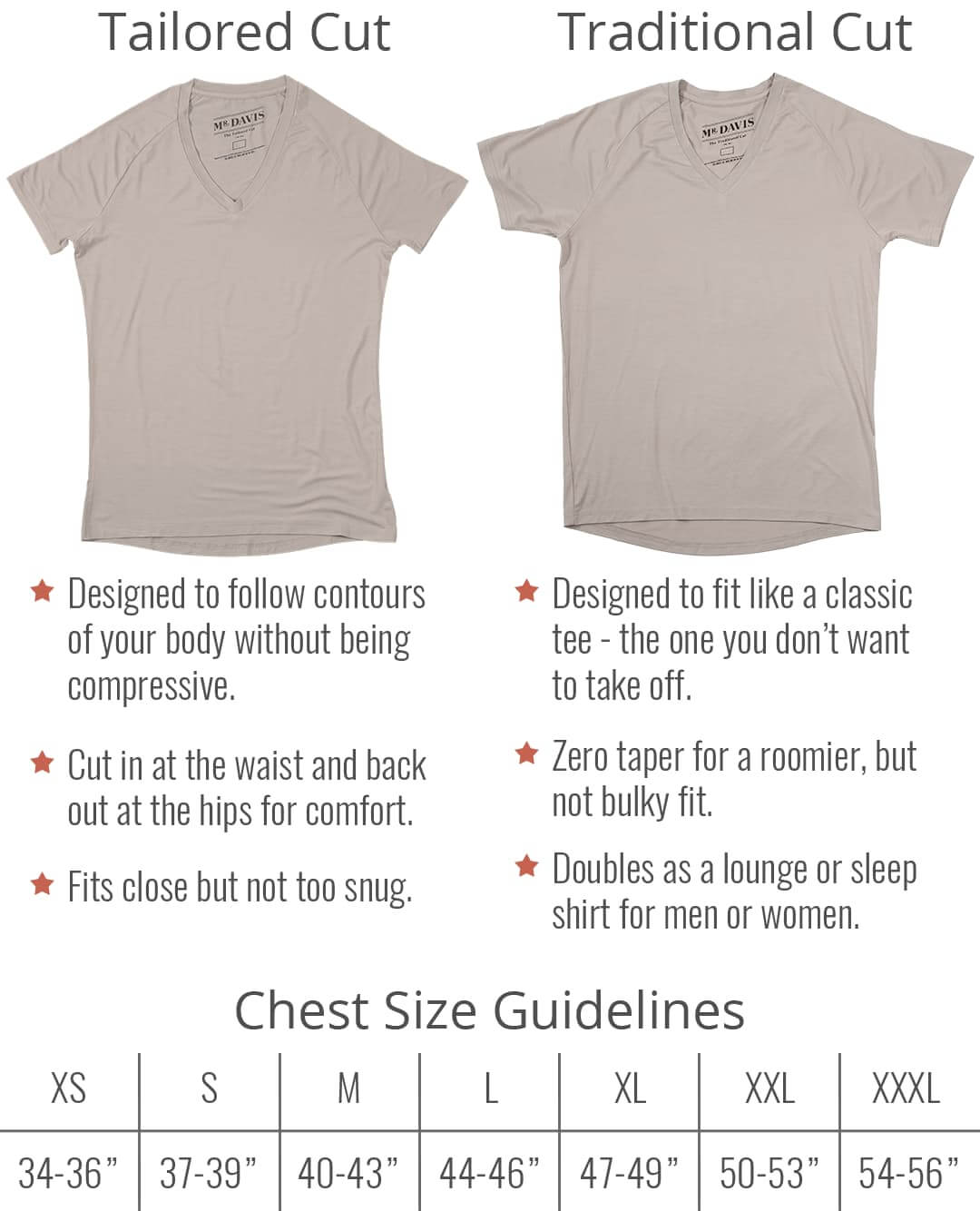 - Our Traditional Cut fits more like a traditional t-shirt. The Tailored cut is for people who prefer a more athletic cut, or who are lean through the waist.